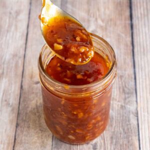 • Honey sriracha sauce in a glass jar with a spoon coming out.