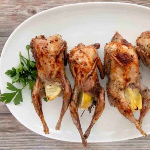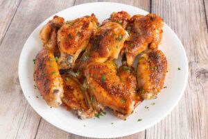 • Picture of chicken tenders on a plate with parsley and red peppers.