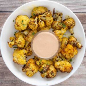 • Bowl of oven-roasted cauliflower with spicy mayonnaise on the side.