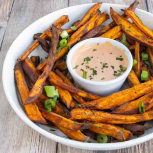 • Air fryer-cooked sweet potatoes with a side of spicy mayo.
