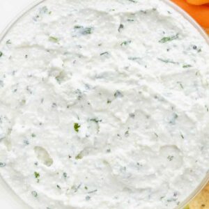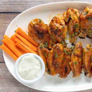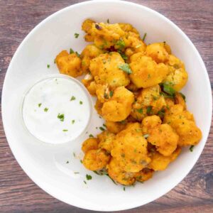 • Bowl of Buffalo cauliflower bites with a side of blue cheese.