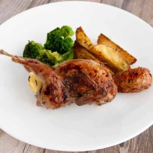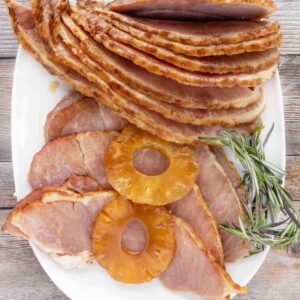 • Plate with a slow-cooker ham, rosemary, and pineapple slices.